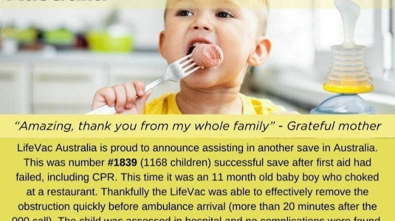 An ambulance response of 20 minutes from the initial call and first aid (including CPR) provided by a nurse was unable to save this 11-month-old when he choked at a restaurant. Luckily a LifeVac device was on hand to save his life, with no harm or complications. This situation is a mirror of the case of Decklan Hayward in Orange; extended ambulance response time, and first aid failed (regardless of the expertise of the rescuer), but in this case, a LifeVac was available. The NSW Education Department and Minister Car cannot continue to rely on the excuse that because first-aid measures and emergency response "should have worked" for Decklan, nothing needs to be done to protect students in NSW schools; or that hiding behind a poor understanding of the law, WHS regulations and outdated policies will protect lives and prevent litigation.