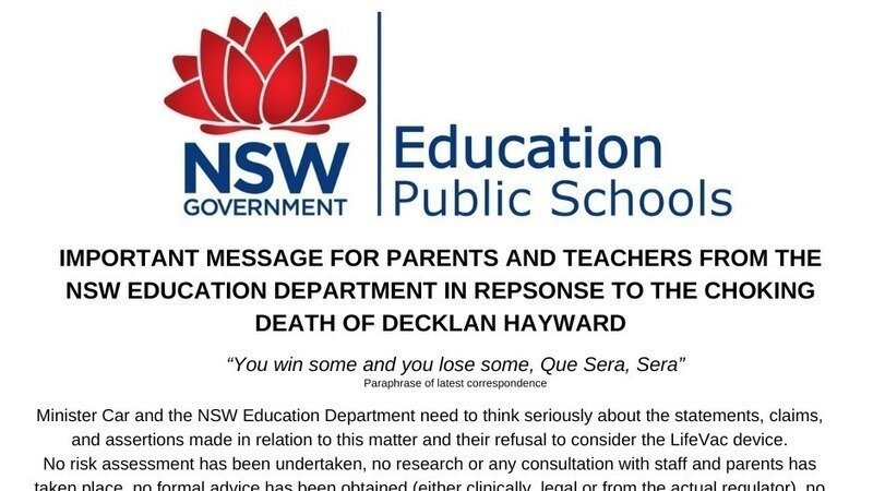 Minister Car and the NSW Education Department need to think seriously about the statements, claims, and assertions made concerning this matter and their refusal to consider the LifeVac device based simply on unevidenced, unresearched assumptions and false statements by its own Department.