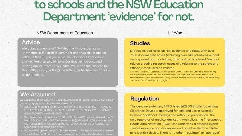 Correspondence to Premier Chris Minns MP about the inaccurate and false information being relied upon by the NS DoE and the Education Minister Prue Car MP concerning the LifeVac device in NSW schools resulted once again in the Premier and the Minister side-stepping any responsibility and again delegating a response to the DoE i.e. the authors of the false and misleading claims made to the Minister in the first place. The DoE then just regurgitated the same old mistruths that they told the Minister, based solely on their interpretation rather than any credible advice from any reputable authority. This may be acceptable to the Minister and the Premier but it it is not acceptable to the parents and teachers of students attending NSW schools. It is also likely to be found to be negligent, at any future Coronial Inquest.