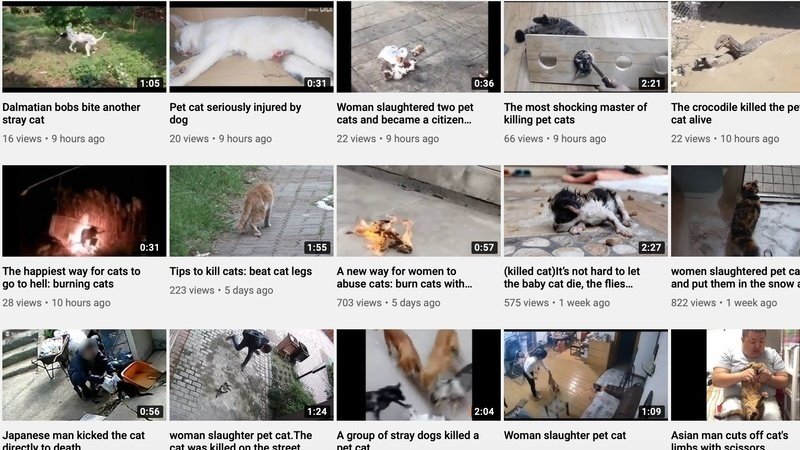There's a Youtube channel called "Animal Killer" that's been uploading videos of animals being tortured and killed. It started out showing videos of cows, pigs and chickens being slaughtered in excessively cruel ways, though they later started showing animal abuse on cats and dogs.