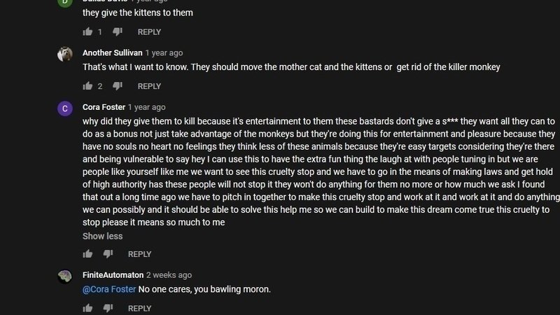 There's a network of monkey channels that appear to be ran by the same people that have been intentionally giving kittens (and occasionally puppies) to aggressive monkeys and filming their deaths.
