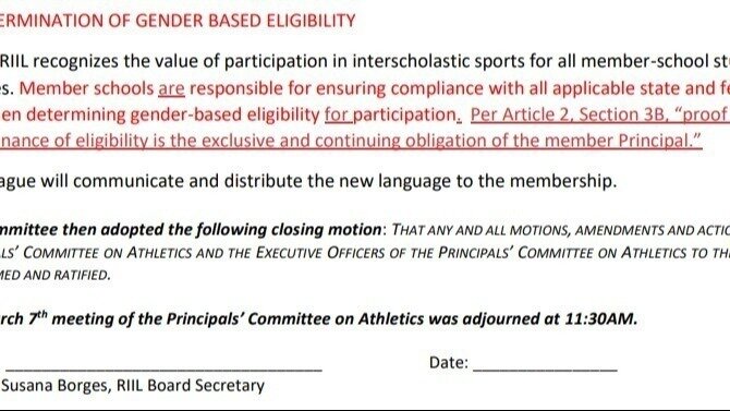 Update 1: The minutes from all 2025 Principals’ Committee on Athletics meetings were released today. We have attached a screenshot of the minutes from the March 7th meeting when they revised the gender policy. It seems to have been the only agenda item that day, the meeting did not originally appear in the list of scheduled meetings, and coincidentally, the “Center for Freedom and Prosperity” released their Civil Rights complaint against RIIL on March 6th. Due to a lack of transparency from RIIL, we are left to speculate (and conclude) that this meeting was a direct response to that complaint. There were 6 folks on the committee that were missing for the vote, but otherwise the committee voted 11-0 to change the policy. Other than those represented on the committee, we don’t know where the 50+ high schools and numerous middle schools in RIIL stand on this issue – we assume they were not consulted as our principal was notified only after the decision was made.