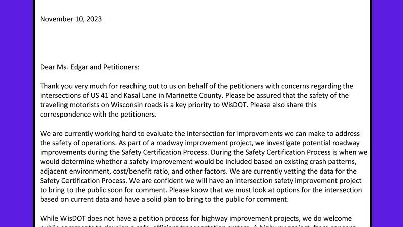 Actualización de la peticiónIMPROVE highway U.S. 41/Kamm Road and Kassel Lane Intersection in Marinette County.Response from Secretary Craig Thompson of WisDOT