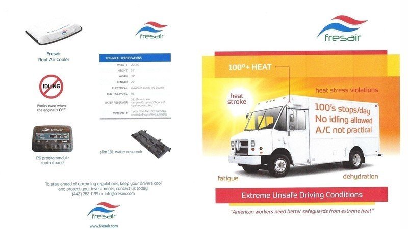 I have had an opportunity to talk to Eric Schuckman owner of Fresair. As Eric states " I see first hand how hard these drivers are working coupled with the excessive heat and no relief...it is simply not safe". Fresair, is a California based company, that provides alternative AC units for companies that care about the safety of their employee's human lives and for the safety of the products it carries. It is an alternative to traditional air-conditioning. The unit is battery-powered and runs off water that is stored within the unit. The unit is called Internal Roof Air Cooler. It is installed as the name implies in the roof of the truck. Eric and I will be providing more specific details on a future live update stay tuned. As always, thank you to my petition signers and for the continuing support!