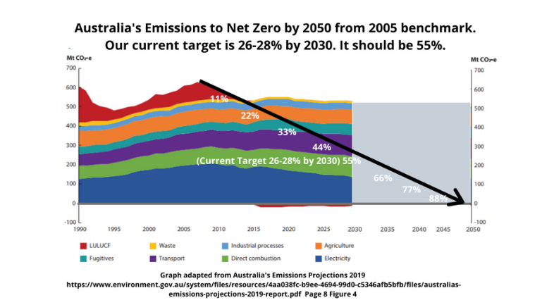 The graph attached of the Dept. of Environment's most recent figures from the Australian Emissions Projection Report Dec 2019, Page 8, Figure 4, and has been extended to 2050