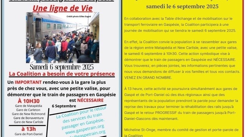 Nous tiendrons un important rassemblement le samedi 6 septembre 2025 dans toutes les gares de la Gaspésie afin d'exprimer clairement que nous désirons le retour du service de train passager en Gaspésie. C'est un besoin.
