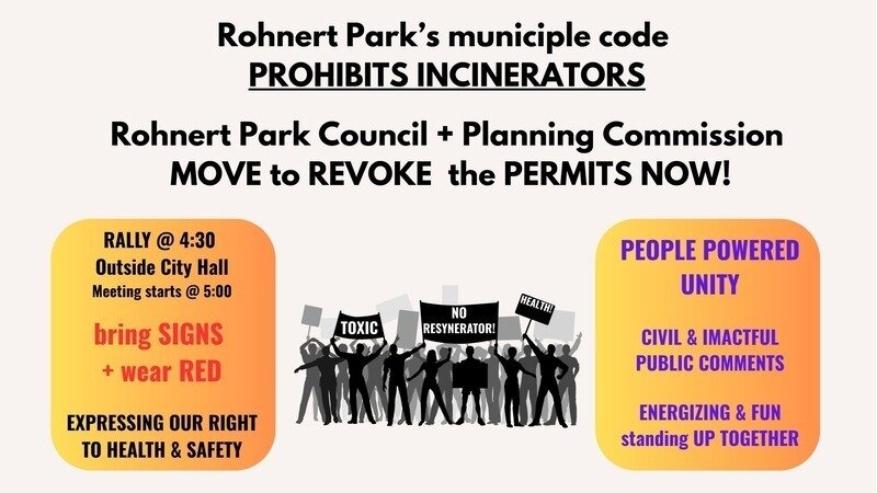 We need a massive show of community presence to demonstrate that Rohnert Park residents will not accept a plastic incinerator in our neighborhood. Please plan to attend and bring friends, neighbors, and family. Every seat filled sends a message.