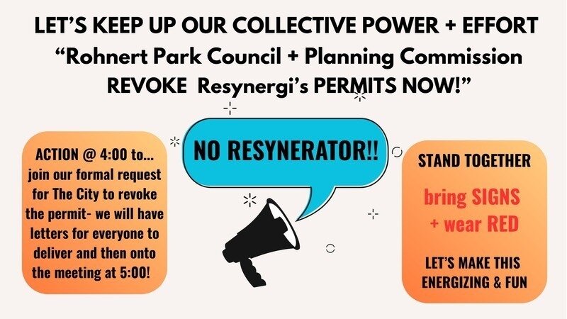 It’s critical to continue to make our voices are heard! Show up at 4:00 to join our formal request to the City of Rohnert Park to revoke resynergi's permit- we will have letters for everyone to sign + deliver to City Hall. After, we will head to the Council meeting by 5:00.