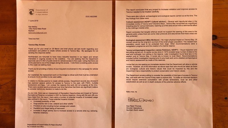 The good news is that the department is willing to consider the possibility of vehicle access to Taronui and it’s willing to work with the Far North District Council.