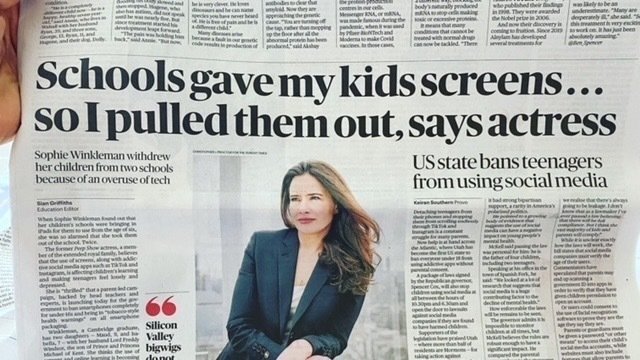 Thank you so very much Sunday Times for the fantastic article this weekend, fronted and contributed to by the fabulous Sophie Winkleman. I support, endorse, get behind, whoop-whoop at and with the group @usforthemuk who have just launched their campaign to completely change the way we view phones in the hands of our youngsters.