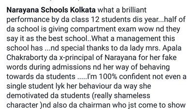 Almost all the Students of Narayana School Kolkata got Compartment and Failed in CBSE Results this Year. The School Took 5 lakhs for 2 years from each student by giving Fake promises and Encouragement to all the Students. The first 6 months of Class 11 was going good enough. Then they started behaving badly with Students.The school itself runs under affiliate of another school. The Results came under " Holy Garden Modern School Berhampore".