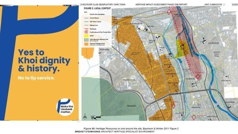 The developers’ heritage consultants also did a remarkable volte-face. In 2018, during a Heritage Appeal Tribunal visit to the River Club site, the LLPT’s Heritage Consultant made the statement conceding that “there’s no contesting of the significance of the site, the site is enormously important.” But in 2019, when the Basic Assessment Report was submitted, their supplementary HIA report stated, in complete contradiction, that “the HIA finds that, apart from the Liesbeek River, the site itself has little obvious heritage significance…”.