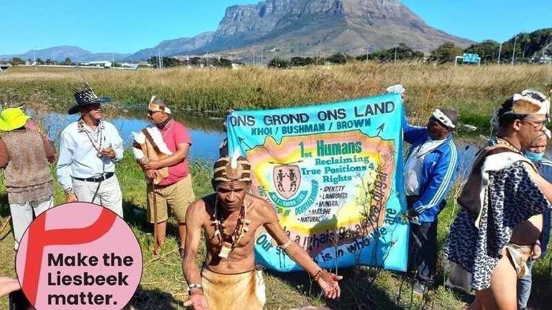 Today our event was attended by a range of Khoi activists, civic members, residents, and NGO supporters who united by following a Freedom walk from the Oude Molen Ecovillage across the Black River to the Liesbeek River in order to say no to the corruption of heritage and the violation of the riverine environment. Through the walk, the speeches and blessing, we remembered the events that have deep meaning for Khoi and San peoples, including the resistance and dispossession that took place on this historic landscape. It was our second such walk after a similar event in 2021. Ceremonies blessed the river and cleansing ceremonies were held to recognise our common spirituality and humanity. We heard speaker after speaker confirm that heritage, which is that which the Khoi people generously share with all people of the region, is not for sale. We heard messages of support from afar, from the Kalahari, from Ogoniland in Nigeria and from Palestine, all sites sharing common struggles of indigenous people against injustice.