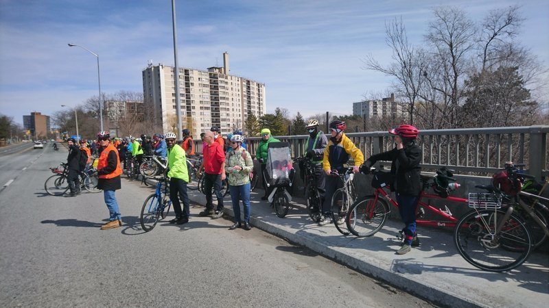 On Wednesday, March 9, more than 100 people took part in the City of Mississauga’s third community meeting for the Bloor Street Integrated Project which saw a clear majority of participants demonstrate support for Alternative #5 which called for uni-directional cycle tracks along the entire route. A significant improvement over the previously recommended bi-directional cycle track west of Dixie Road. This was followed by a ride on Sunday, March 20 in which about 80 to 100 people from Toronto and Mississauga biked on Bloor and converged at Etobicoke Creek to show support for bike lanes on Bloor in Toronto and Mississauga. Thanks to those of you who participated in the consultation and/or ride. Unfortunately, Mississauga City Council requested yet another meeting for the Bloor project over objections to Alternative #5 from the Applewood Hills & Heights Residents Association.