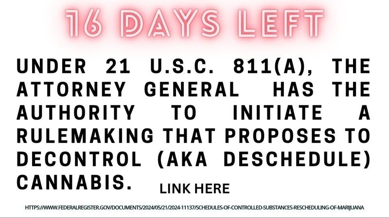 We have 16 days left to push for the decontrol (descheduling) of cannabis! The DEA and HHS's own analysis shows the lower abuse potential and significant medical benefits of cannabis. Let's not settle for rescheduling – we need to decontrol now! Sign and Share the petition. Submit your comments and spread the word.