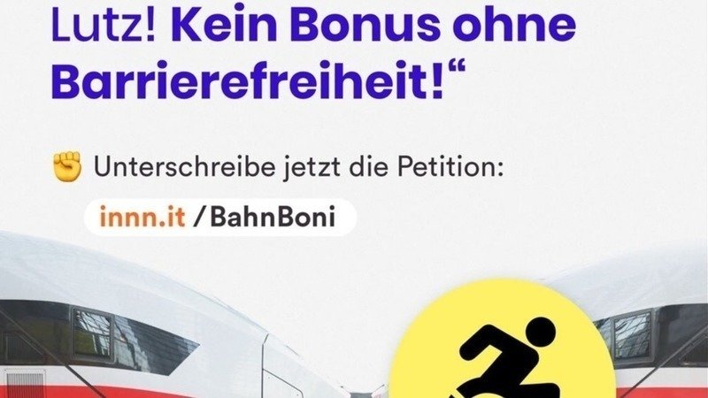 (Bildbeschreibung: Fotomontage vom ICE Zug und einem Rollstuhlsymbol; Text: Kein Bonus ohne Barrierefreiheit! Dann der Link zur Petition auf Innn.it - https://innn.it/bahnboni/