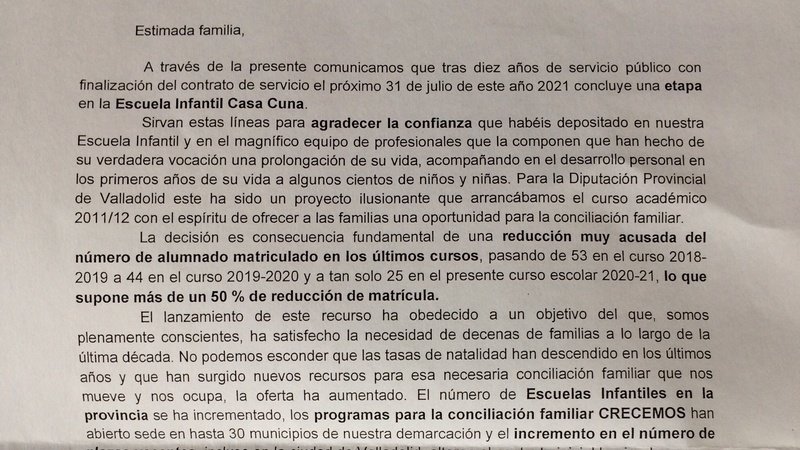 Petition updateNO AL CIERRE DE ESCUELA INFANTIL CASA CUNA (Valladolid)Carta recibida hoy a fecha 2 de febrero