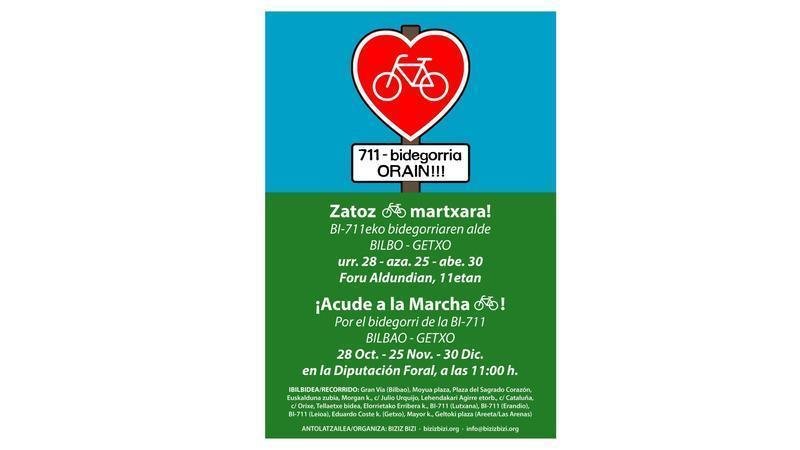 La marcha por el bidegorri de la 711 pasa a celebrarse una vez al mes. Tal y como se decidió en la última marcha de septiembre, vamos a reivindicar nuestro bidegorri con más animo si cabe, que se lo merece.