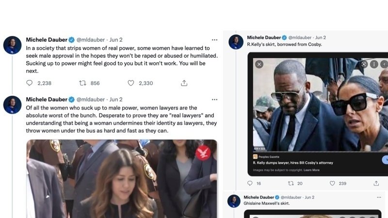 Ms. Dauber repeatedly has taken to Twitter to verbally assault women lawyers who represent controversial clients she dislikes. In addition, some of her statements are so broad and shallow that can be read to imply that all men are rapists and abusers.