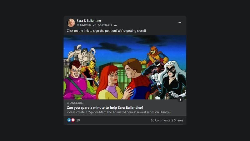 Please share the link to this petition on Twitter, on Facebook, and on any other website you may use and please ask your friends if they would like to sign this petition as well. If you would like to be a Paid Promoter to help get this petition Promoted/Trending on the Change website, then please donate a small amount, even if it's only $2.20, $3.07, $4.00, $5.00, or $7.37. Every little bit helps our cause more than you might think. The more signatures we collect for this petition and the more awareness that we get for this cause, the more likely our dream of seeing a "Spider-Man: The Animated Series" revival on Disney Plus might become a reality!