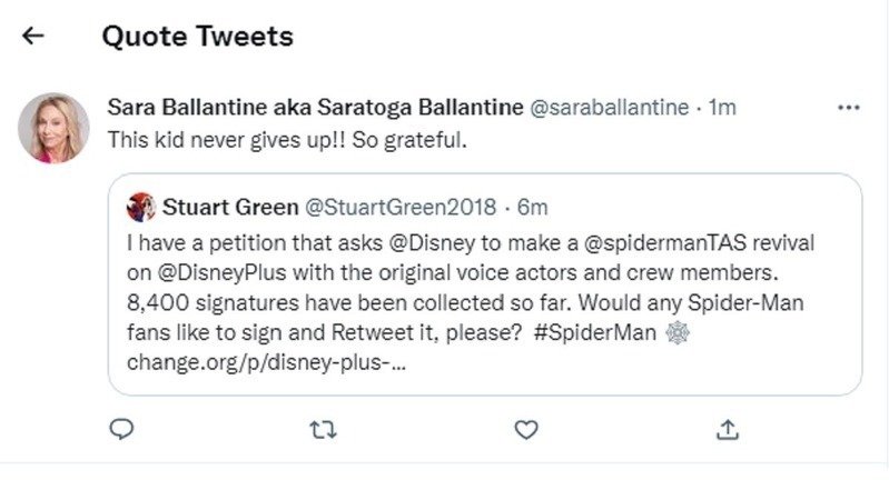 Our petition asking The Walt Disney Company to make a "Spider-Man: The Animated Series" revival series on Disney Plus with the original voice actors and crew members was recently shared on Twitter last night by Saratoga Ballantine, a.k.a. the voice of Mary Jane Watson on this animated series, and we now have 8,403 total signatures collected so far! That's truly amazing! If we get 1,597 more signatures for this petition, we'll finally reach the 10,000 signatures milestone! 10,000 is one of the most important milestones for this petition, so let's see if we can reach our next goal!