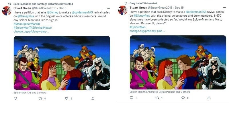 Our petition asking The Walt Disney Company to make a "Spider-Man: The Animated Series" revival series on Disney Plus with the original voice actors and crew members currently has 8,606 total signatures! We're only 1,394 away from reaching the 10,000 signatures milestone! This is marvelous news! I would also like to thank again the two voice actors from this animated series, Saratoga Ballantine (the voice of Mary Jane Watson) and Gary Imhoff (the voice of Harry Osborn/the second Green Goblin), who were kind enough to recently share my post on Twitter linking this petition on their official Twitter pages. I sincerely appreciate all of their help and support.