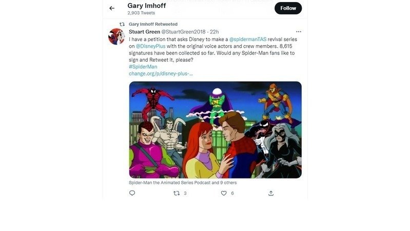 Our petition asking The Walt Disney Company to make a "Spider-Man: The Animated Series" revival series on Disney Plus with the original voice actors and crew members currently has 8,626 total signatures so far and voice actor Gary Imhoff (the voice of Harry Osborn/the second Green Goblin) was kind enough to share my latest Twitter post with the link to this petition on his official Twitter page! That's truly amazing!