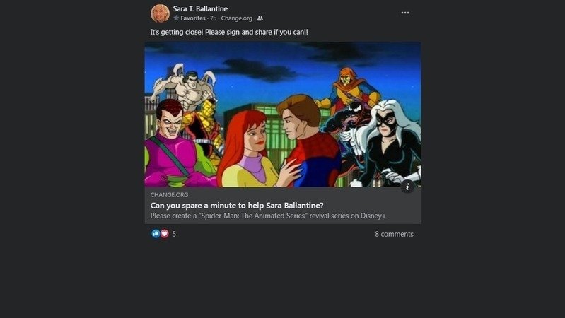 Please continue to share the link to this petition on websites you may use, such as Twitter and Facebook, and be sure to ask your friends to sign this petition as well! If you would like to be a Paid Promoter to keep our petition Trending on the Change website again to help raise awareness for our cause, then please be sure to donate a small amount, even if it's only $1.99, $2.30, $3.07, $5.41, or $7.47. Every little bit helps our cause more than you realize. The more signatures we collect for this petition and the more awareness we get for our cause, the more likely our dream of seeing a "Spider-Man: The Animated Series" revival on Disney Plus might become a reality!