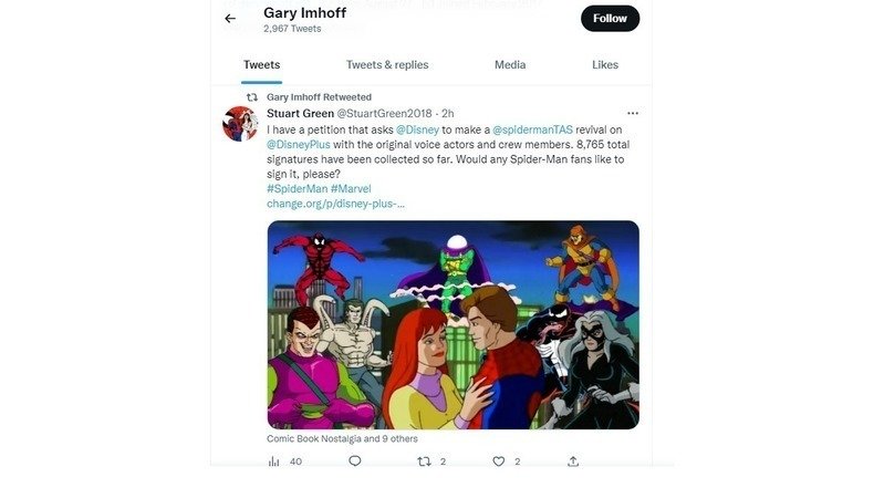 Greetings, True Believers! Our petition asking The Walt Disney Company to make a "Spider-Man: The Animated Series" revival series on Disney Plus with the original voice actors and crew members currently has 8,767 total signatures! Our petition was Trending on the Change website, thanks to a $50 donation from a Paid Promoter, and Gary Imhoff (the voice of Harry Osborn/the second Green Goblin) Retweeted the link to this petition on his official Twitter account last night! That's truly amazing!