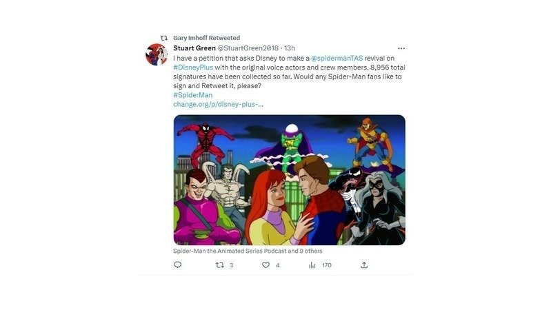 Our petition that asks The Walt Disney Company to make a "Spider-Man: The Animated Series" revival on Disney Plus with the original voice actors and crew members was shared on Twitter by voice actor Gary Imhoff, a.k.a. the voice of Harry Osborn/the second Green Goblin on the '90s Spider-Man animated series! We currently have 8,957 total signatures so far and we only need 1,043 more signatures to reach the next milestone of 10,000 signatures! That's truly amazing!