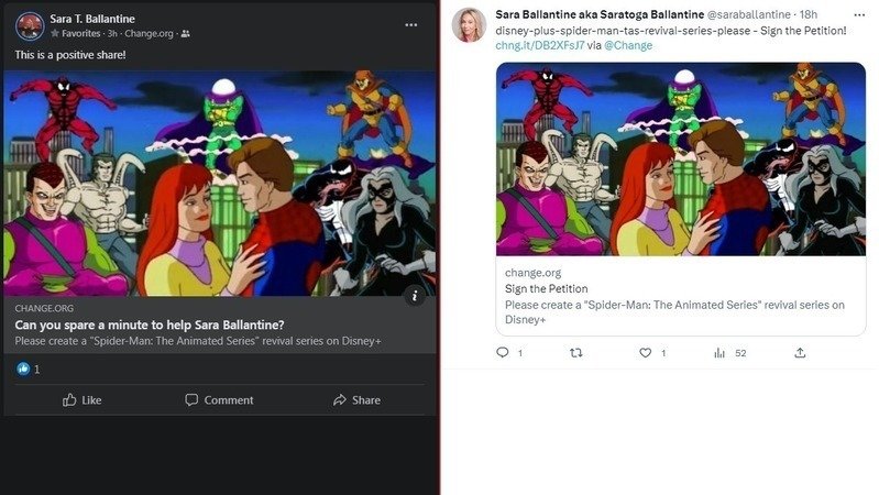 Our petition that asks The Walt Disney Company to make a "Spider-Man: The Animated Series" revival on Disney Plus with the original voice actors and crew members was shared on both Facebook AND Twitter by voice actress Sara Ballantine, a.k.a. the voice of Mary Jane Watson on the '90s Spider-Man animated series! That's marvelous news!