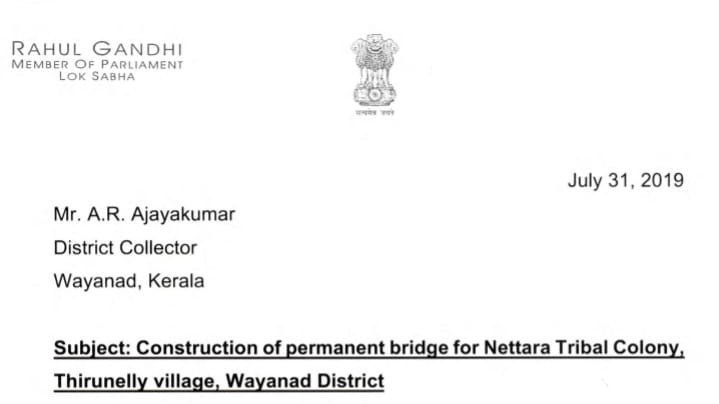 Wayanad MP Rahul Gandhi writes to District Collector Mr. Ajaykumar for the construction of a permanent bridge in Thirunelly for the benefit of Nettara tribal community.