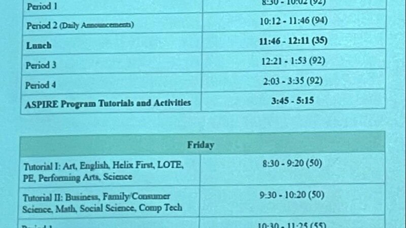 Helix Charter Highschool is trying to change the entire bell schedule for the 2024-2025 school year. Class will go from being 80 minutes to 94 minutes, there will no longer be tutorial on Monday-Thursday, tutorial will only be before school on Fridays, and we will no longer have a nutrition break. This is NOT beneficial for students, tutorial being spread throughout the week means flexible availability for ALL students, and help will be available more than just 1 day a week. Nutrition break also provides students a chance to rest their minds for a little and catch up with friends they might not get to see throughout the day. Even teachers are complaining about the schedule, saying that is an unnecessary change that will cause problems for a lot of students. This abrupt change might also stress lots of students out, especially ones who are nearing the end of their high school career. Please sign and share to raise our voices against the helix administration and tell them how terrible this new schedule is!