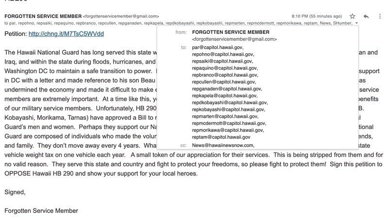 Aggiornamento sulla petizioneDON'T TAKE AWAY BENEFITS FROM OUR HAWAII NATIONAL GUARD SERVICE MEMBERS! OPPOSE HB290CALL AND EMAIL THESE HAWAII LEGISLATORS