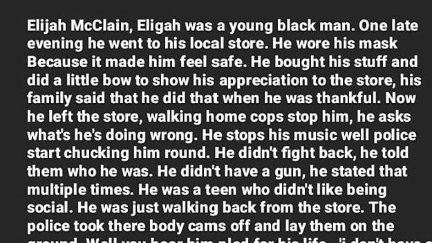 Elijah McClain, Elijah was a young black man. One late evening he went to his local store. He wore a mask because it made him feel safe. He bought his stuff and did a little bow to show his appreciation to the store, he’s family said he did that when he was thankful. Now he left the store. Walking home cops stop him. He asks what his doing wrong and the cops take off there body cameras. He stops his music and the police start chucking him around. He didn’t fight back, he told them who he was. He didn’t have a gun, he stated that a couple of times. He was a teen who didn’t like being social. He was just walking home. Through the video you can hear him pleading for his life, “ I don’t have a gun, I don’t do that kind of stuff I don’t even eat meat I’m a vegetarian.” You hear him state over and over again. Elijah lost his life that night for no reason. All because he was a black man wearing a mask. And if you were getting stopped and mistreated by a police officer, but Elijah didn’t because he was a kind boy who wouldn’t hurt a fly. After killing him the three police officers took a selfie. After killing an innocent man. And an innocent family lost there son because a police officer misjudged a man by the colour of his skin. This is not over. Black lives matter isn’t a trend. The police officers were given NO jail time no nothing. Sign this petition and help me stop racial injustice.