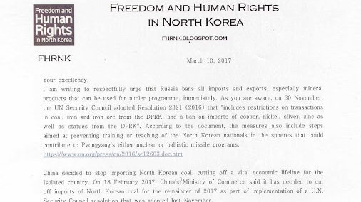 I am writing to respectfully urge that Russia bans all imports and exports, especially mineral products that can be used for nuclear programme, immediately. As you are aware, on 30 November, the UN Security Council adopted Resolution 2321 (2016) that 'includes restrictions on transactions in coal, iron and iron ore from the DPRK, and a ban on imports of copper, nickel, silver, zinc as well as statues from the DPRK". According to the document, the measures also include steps aimed at preventing training or teaching of the North Korean nationals in the spheres that could contribute to Pyongyang's either nuclear or ballistic missile programs.