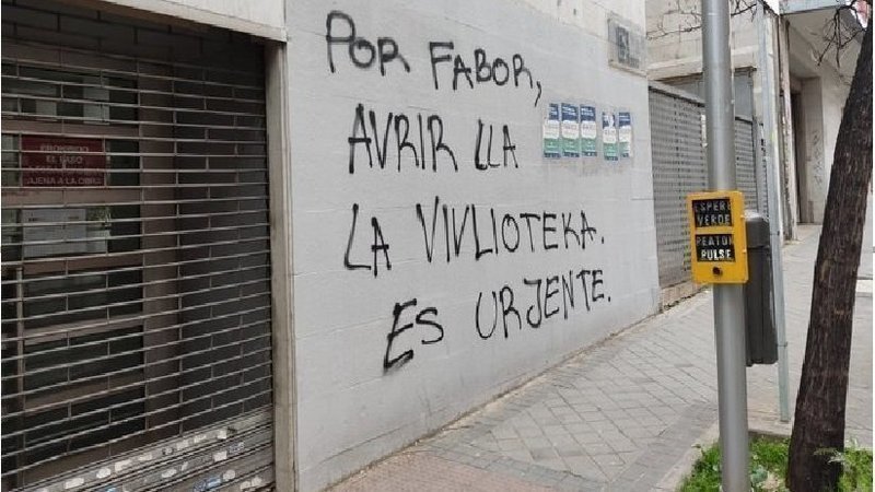Esta semana, una pintada en su fachada recordaba con guasa y acierto la necesidad de estos espacios: "Por fabor, avrir la vivlioteka. Es urjente". No vayáis a buscarla, pues la diligencia que les ha faltado para hacer las obras de la biblioteca es la que han tenido para borrar la inscripción, vista la repercusión que ha tenido en las redes sociales, y ya está borrada y medio tapada (muy chapuceramente, por cierto). Yo os acompaño la foto para que la veáis, y os invito a seguir compartiendo esta petición, mientras buscamos nuevas vías para reclamar la reapertura de este centro