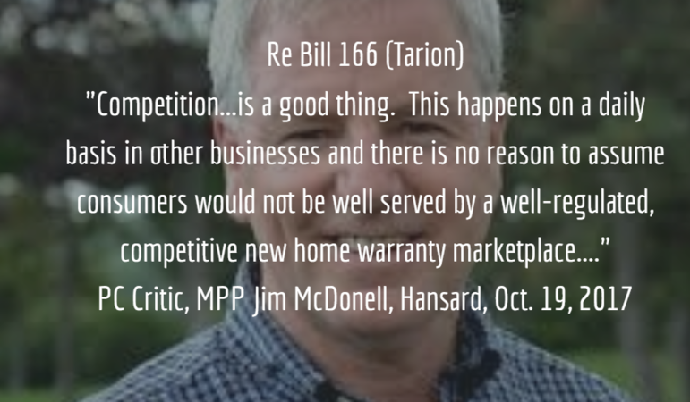 It's great to see the Critic for Ontario's official opposition agreeing that Tarion's monopoly needs to end! MPP Jim McDonell had signed this petition previously, but yesterday he made it official in the Ontario Legislature as the debates regarding Bill 166 kicked off.