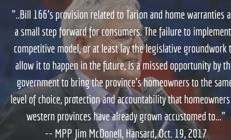 Kampanya güncellemesiEnd Tarion’s new home warranty monopoly NOW: Give Ontarians a choice!MPP McDonell: Bill 166 "a missed opportunity"