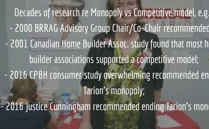 Petition updateEnd Tarion’s new home warranty monopoly NOW: Give Ontarians a choice!Enough research - Let's get on with ending Tarion's monopoly via Bill 166
