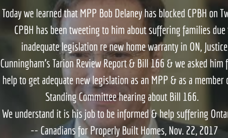 Given MPP Delaney's decision to block CPBH on Twitter, and given the importance of Bill 166 to consumers, CPBH has requested that MPP Delaney be removed from the committee considering Bill 166. We await the Liberal's decision on this. The committee reconvenes on Monday/Tuesday next week to discuss Bill 166 so we don't have much time.