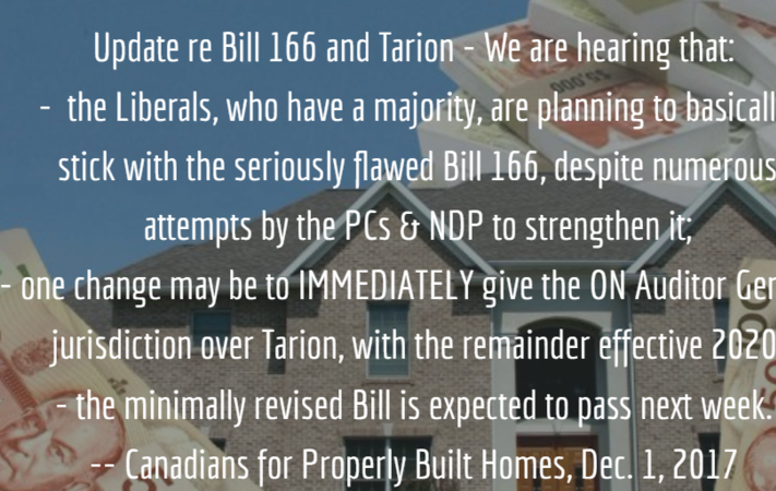 Mise à jour sur la pétitionEnd Tarion’s new home warranty monopoly NOW: Give Ontarians a choice!The latest chapter re Tarion and Bill 166, and we're not giving up!