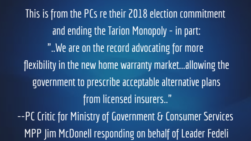 Actualización de la peticiónEnd Tarion’s new home warranty monopoly NOW: Give Ontarians a choice!What will the PCs do re Tarion's Monopoly if elected June 7, 2018?