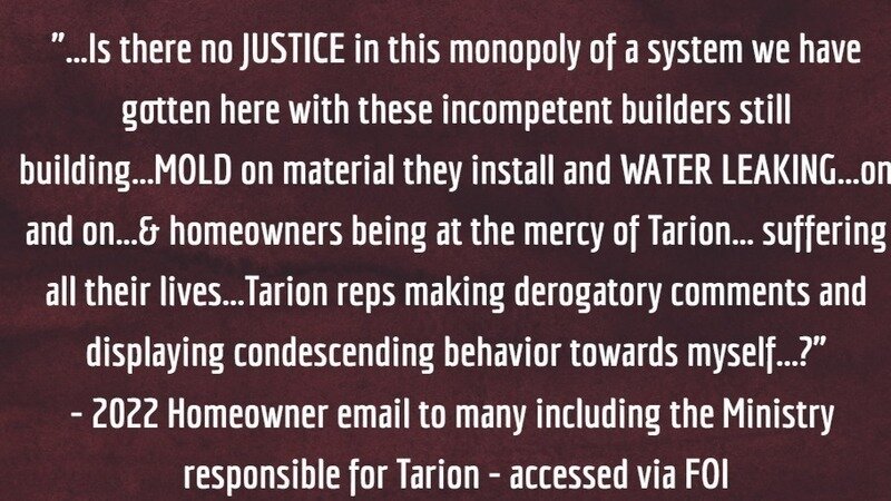 CPBH has also heard from homeowners over the decades that they won't write to the Ontario Government about issues with Tarion anymore as they feel that the ministry responsible for consumer protection (now called Public and Business Service Delivery - PBSD) has an "anti-consumer" culture.