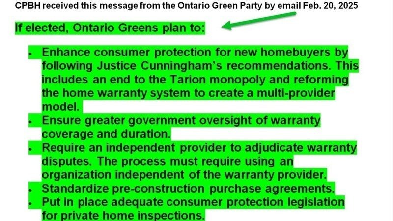 As the Ontario election is approaching, CPBH has heard from the Ontario Greens are continuing to support Ontario's purchasers of newly built homes. They still commit to end Tarion's monopoly! The Greens understand the problems with Tarion.