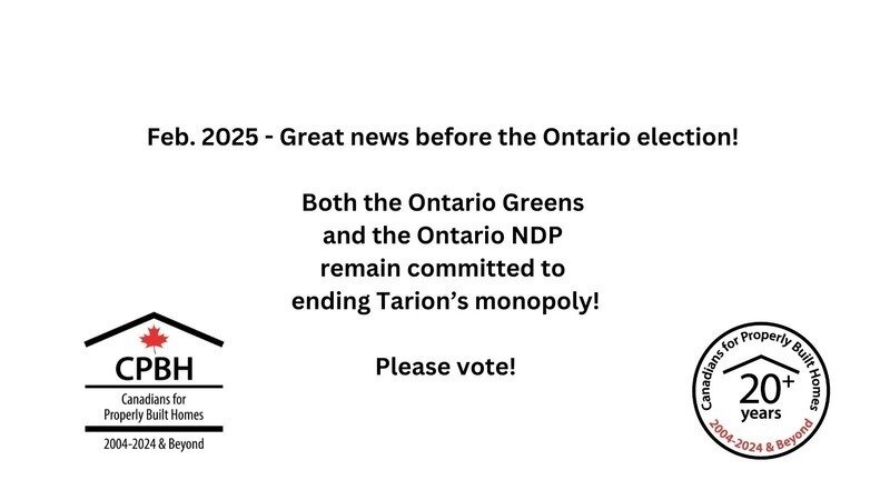 Actualización de la peticiónEnd Tarion’s new home warranty monopoly NOW: Give Ontarians a choice!Please vote! Let's get rid of the Tarion Monopoly!