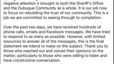 It is our understanding that many members of the community had concerns about Matt being hired. We apologize for being the cause for that concern and for the negative attention it brought to both the Sheriff’s Office and the Dubuque Community as a whole. It is our job now to focus on rebuilding the trust of our community. This is a job we are committed to seeing through to completion.