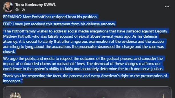 "The Pothoff family wishes to address social media allegations that have surfaced against Deputy Mathew Pothoff, who was falsely accused of sexual abuse several years ago. As his defense attorney, it is crucial to clarify that after a rigorous examination of the evidence and the accuser admitting to lying about the accusation, the prosecutor dismissed the charge and the case was closed.