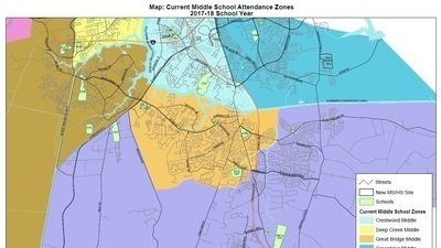 The Chesapeake Public Schools School Board is weighing options for the establishment of new attendance zones. One of the options (written as “Option 2”), Reassign portions of Hickory Middle School and Hickory High School to Great Bridge Middle School and Great Bridge High School.