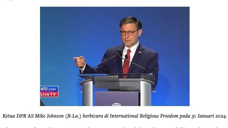 (Minghui.org) Ketua DPR AS Mike Johnson (R-La.) berbicara di KTT International Religious Freedom (IRF) pada 31 Januari 2024. Dia mengecam Partai Komunis Tiongkok (PKT) karena mengambil organ secara paksa untuk transplantasi dari praktisi Falun Gong yang masih hidup. Falun Gong adalah latihan spiritual dan meditasi yang prinsip panduannya adalah Sejati, Baik, Sabar. PKT melancarkan penganiayaan terhadap Falun Gong pada bulan Juli 1999, dan berlanjut hingga hari ini.